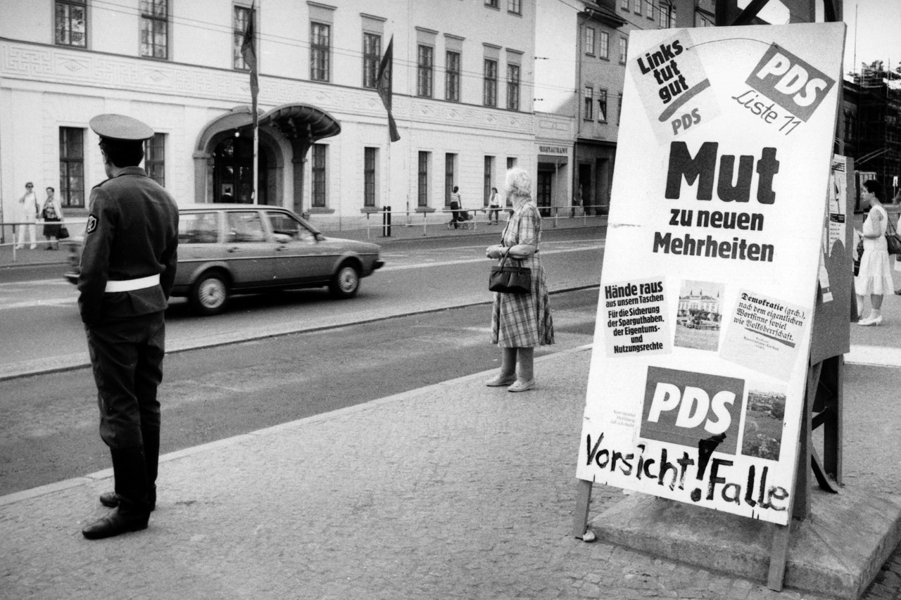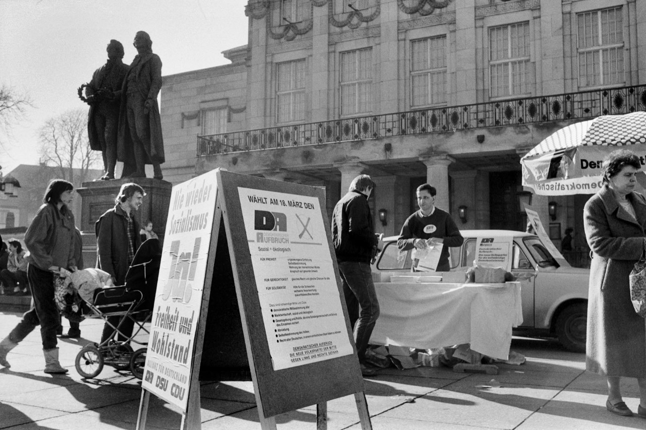 Weimar, im Februar 1990. Seit Wochen ist auch das Zentrum der Kulturstadt mit Sichtreklame für politische Parteien unterschiedlichster Couleur zugetackert. Die ersten demokratischen und freien Wahlen zur Volkskammer der DDR stehen an. So wandelt man durch einen Parcours unterschiedlichster Parteienreklame. Am Goetheplatz prangt ein Aufsteller der SED-Nachfolgepartei PDS, der mit dem Slogan „Links tut gut" wirbt. Freilich ist der mit einem entsprechenden Kommentar mittels schwarzem Edding beschrieben: „Vorsicht, Falle!". Auf dem Schaufenster des „HO Textil – Ecks" an der Geleitstraße kleben Ankündigungen von Wahlkampf-Reden für FDP und SPD. Hans Dietrich Genscher spricht am 24. Februar um 13.30 Uhr auf dem Theaterplatz. Willy Brandt spricht am 04. März in Weimar. „Vertrauen vor Ort" nennt sich seine Rede. Daneben hängt ein Wahlplakat der CDU mit dem unvermeidlichen Titel „Wir sind ein Volk!". „Freiheit ist Leistung" wirbt der Bund Freier Demokraten. Auf dem Theaterplatz wurde neben dem Dichterdenkmal ein Trabant Kombi zum mobilen Wahlkampf-Stand umfunktioniert. Ein Freiwilliger verteilt Handzettel für gleich mehrere Parteien, die als sogenannte „Allianz für Deutschland" agieren. Hier wird für den „Demokratischen Aufbruch" und die „Deutsche soziale Union" getrommelt.