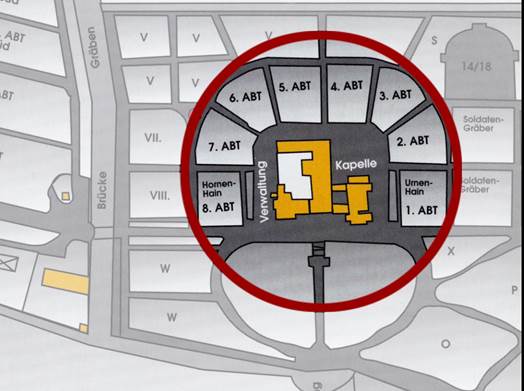 Der Urnenhain war 1911 um das zentrale Gebäude des Hauptfriedhofes in einer Korbbogenform errichtet worden. (wk)